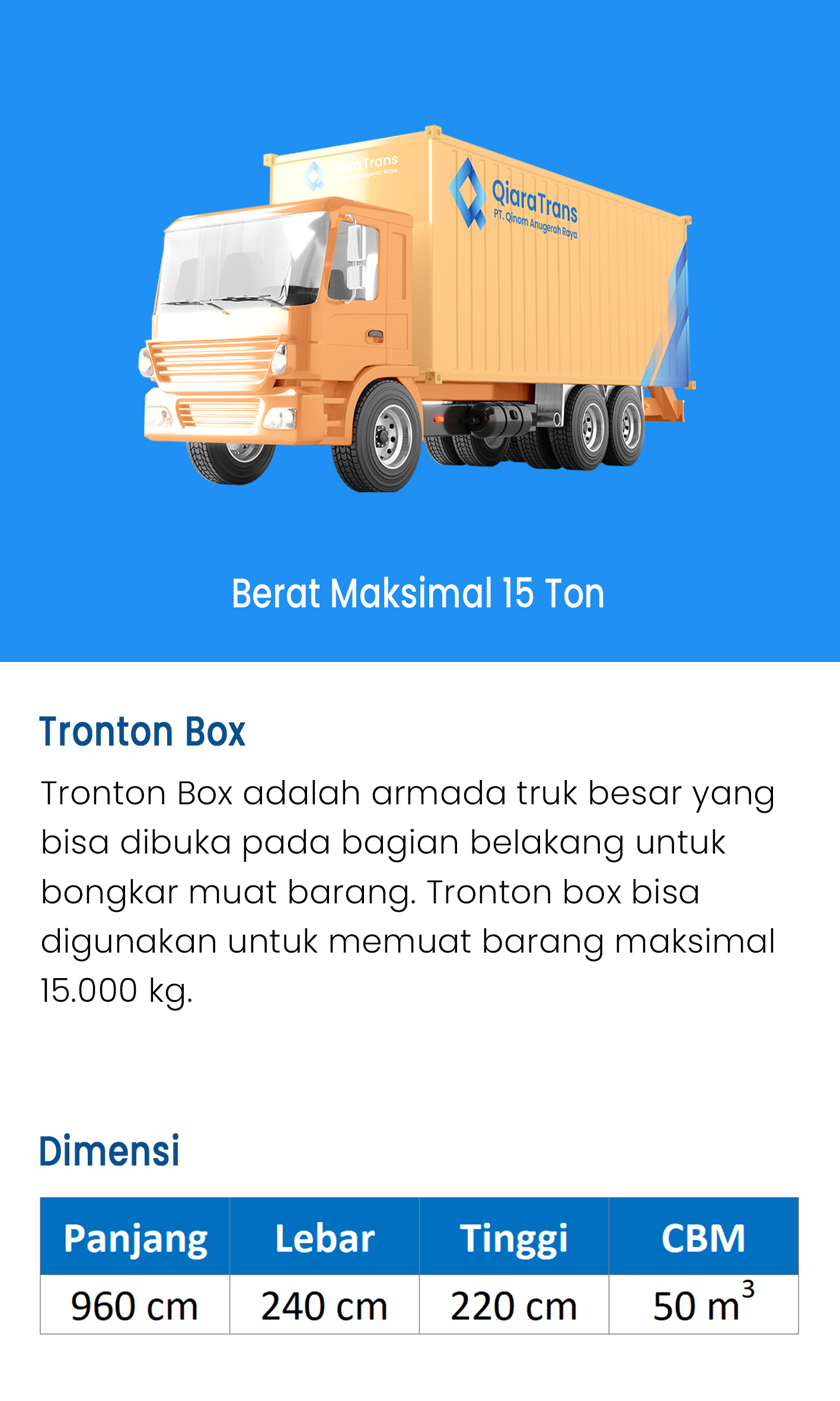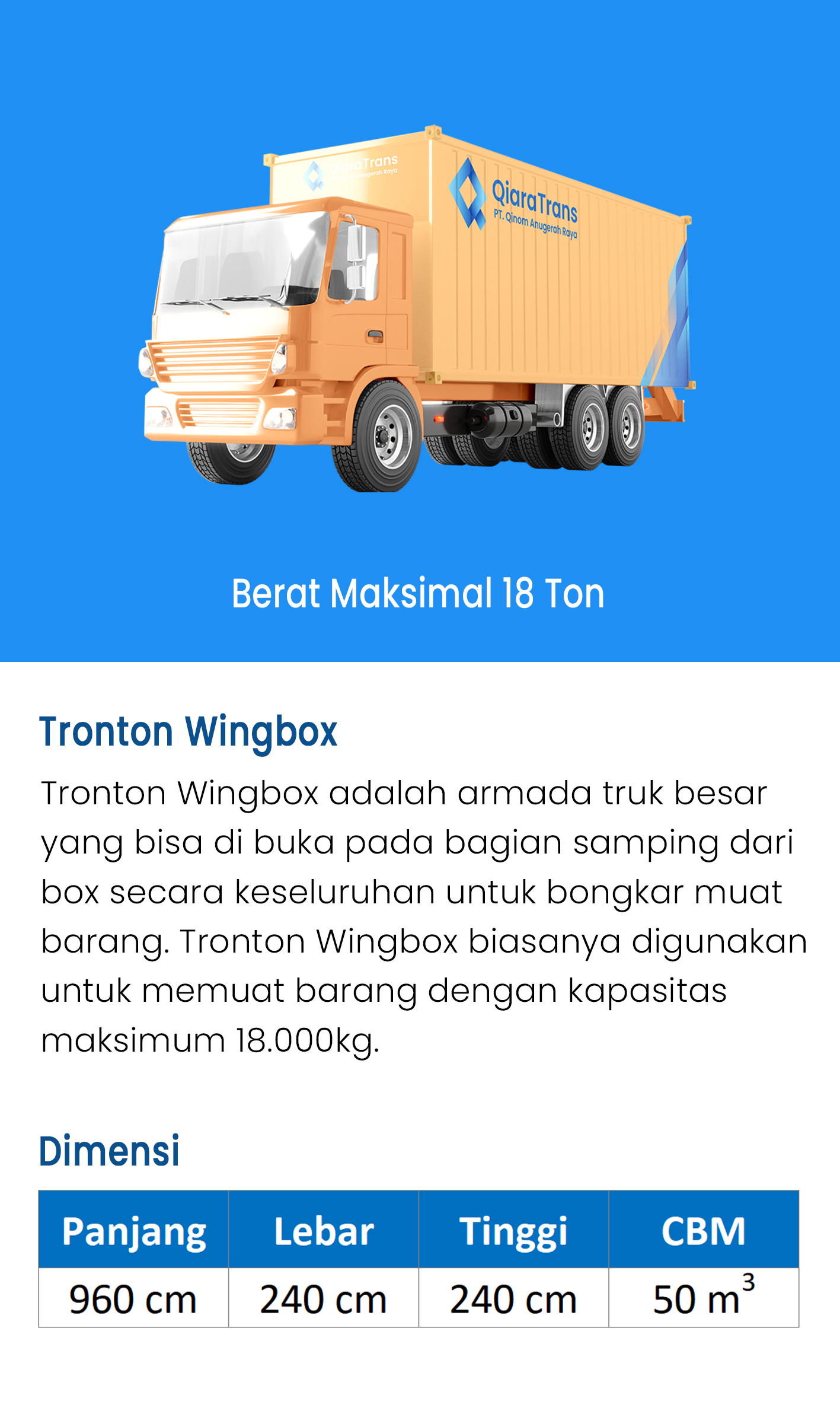 Tronton Wingbox adalah armada truk besar yang bisa di buka pada bagian samping dari box secara keseluruhan untuk bongkar muat barang. Tronton Wingbox biasanya digunakan untuk memuat barang dengan kapasitas maksimum 18.000kg.